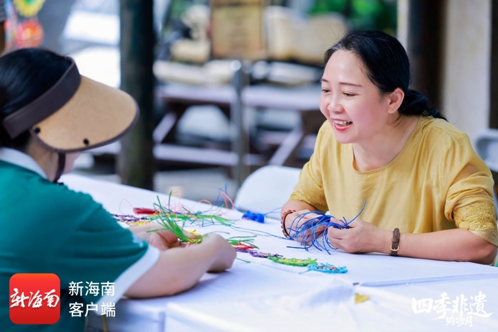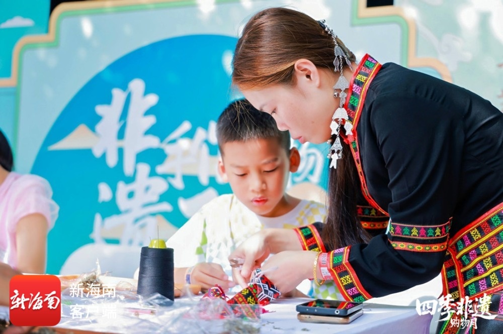 除了丰厚的非遗展销,现场还设置了“随风而动——非遗手作景物工坊”。接连三天,椰雕、草编、黎锦等相关非遗手作轮流上台,不少家长带着孩子一同参加体会,现场气氛火热。“跟着传承人学非遗,既了解了文明,又着手实践,孩子很喜欢,收成很大。”一位参加家长共享道。