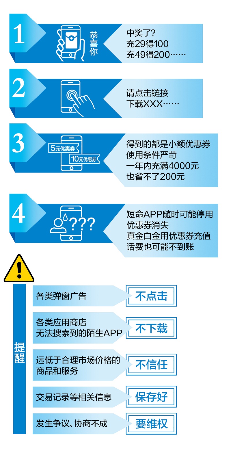 “让消费者在充话费前先成为会员,以获取个人信息、收取会费,为小众App打广告、引流量,一个‘科技公司’可吸纳数以万计的客户。”针对相关骗局短时间内集中爆发现象,自贡市市场监管局、自贡市保护消费者权益委员会发布提示,称这些公司收取会员费和客户的充值话费后不及时为客户充值,可能有占用资金甚至“跑路”的风险。