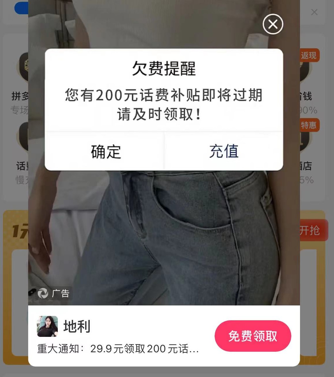 在页面设计上,广告更是费尽心思。记者下载一款被提及较多的“超惠购”App,打开后即弹出几乎占满屏幕的红色信封,上写“恭喜发财大吉大利”,中间大大的“开”字。再次重新进入,画面又变为“今日红包待领取”,伴随钱币碰撞的哗啦哗啦声,引诱意味十分强烈。第三次进入,则变为貌似严肃、白底黑字的“欠费提醒”,告知“有200元话费补贴即将过期”,要及时领取。